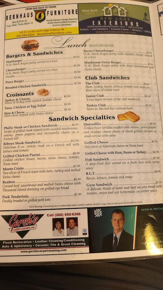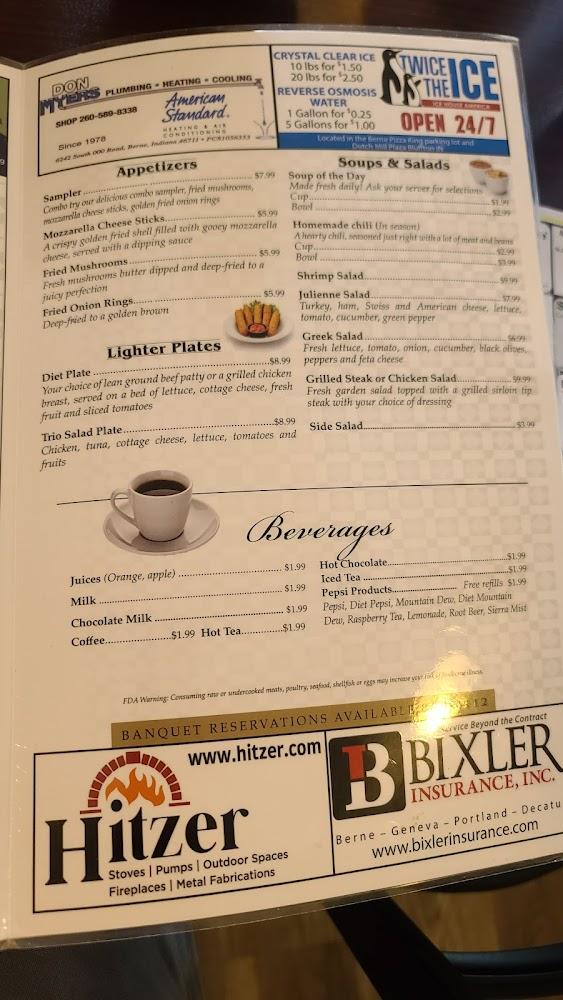 Welcome to Berne Dining, your family-friendly restaurant located in the heart of Berne, Indiana. We specialize in serving delicious breakfast, lunch, and dinner, showcasing local favorites and offering an extensive menu of healthy options. Enjoy the warm ambiance and relaxed atmosphere while indulging in our excellent coffee and mouthwatering desserts. With services like takeout, delivery, and a private dining area, we aim to cater to everyone, including families and solo diners. Our accessible facilities ensure a comfortable experience for all. Join us for a meal that's sure to delight, or make a reservation today!